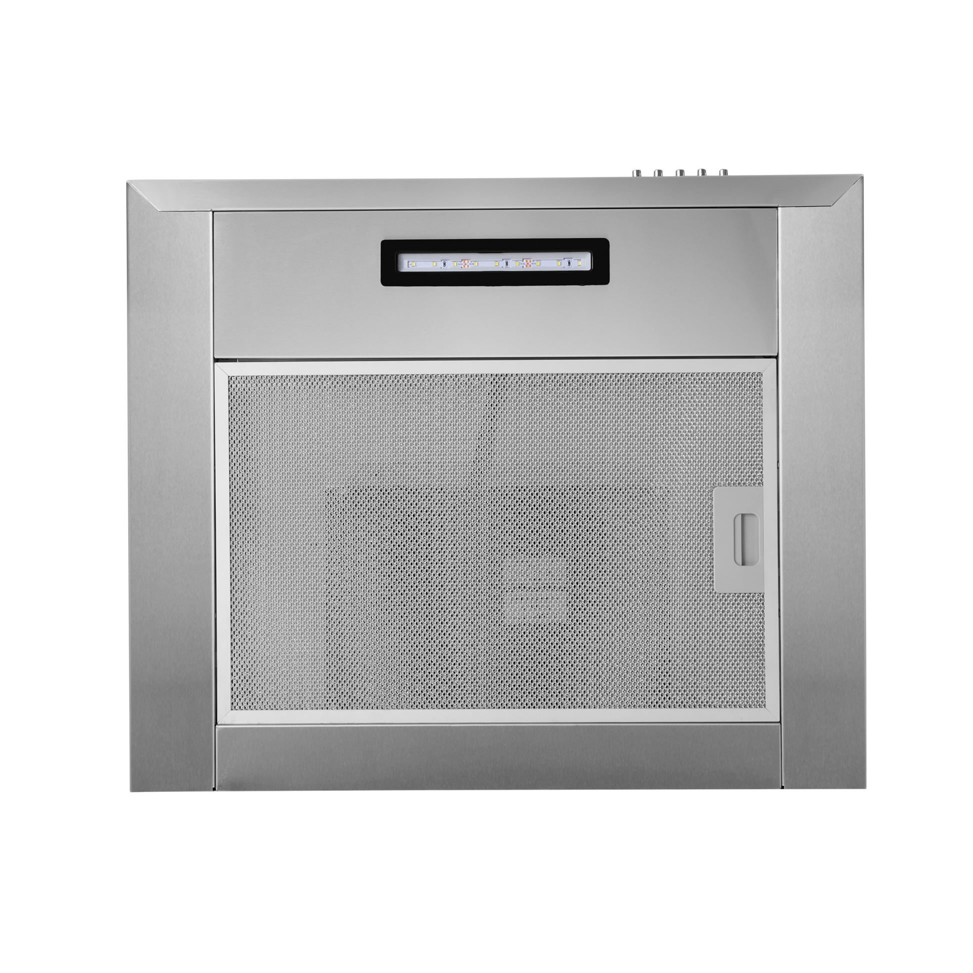 Está equipada con un motor de alto desempeño con doble aspiración y tres niveles de velocidad, que asegura una ventilación eficiente y constante. Su sistema de extracción interna permite elegir entre salida al exterior o uso con filtro de carbón activado, ofreciendo flexibilidad en la instalación.