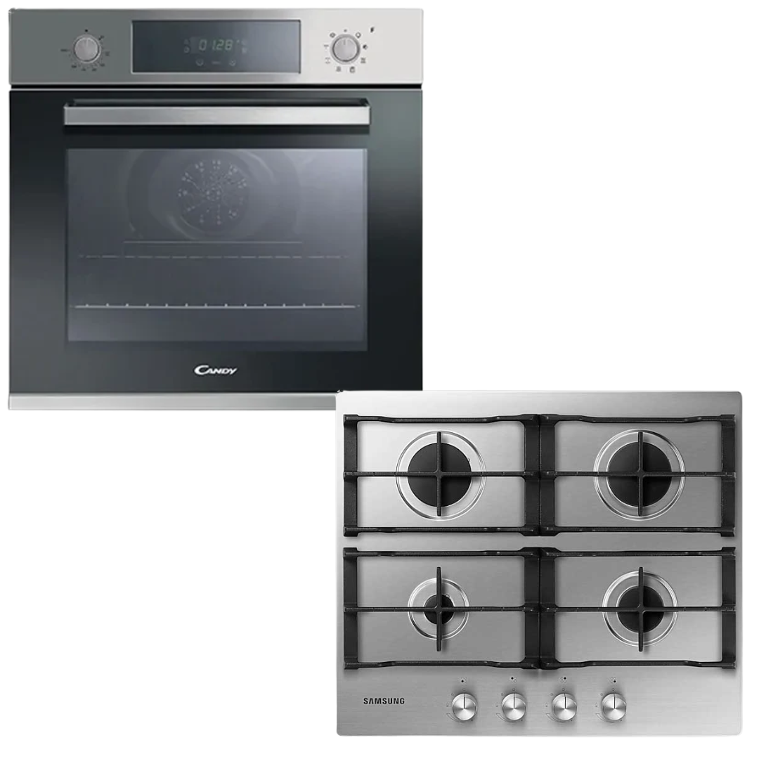Incluye el Horno Eléctrico Candy FCP605X de 65 litros y el Anafe a Gas Samsung NA64H de 4 hornallas, ambos con materiales premium y funciones prácticas para un uso diario eficiente.