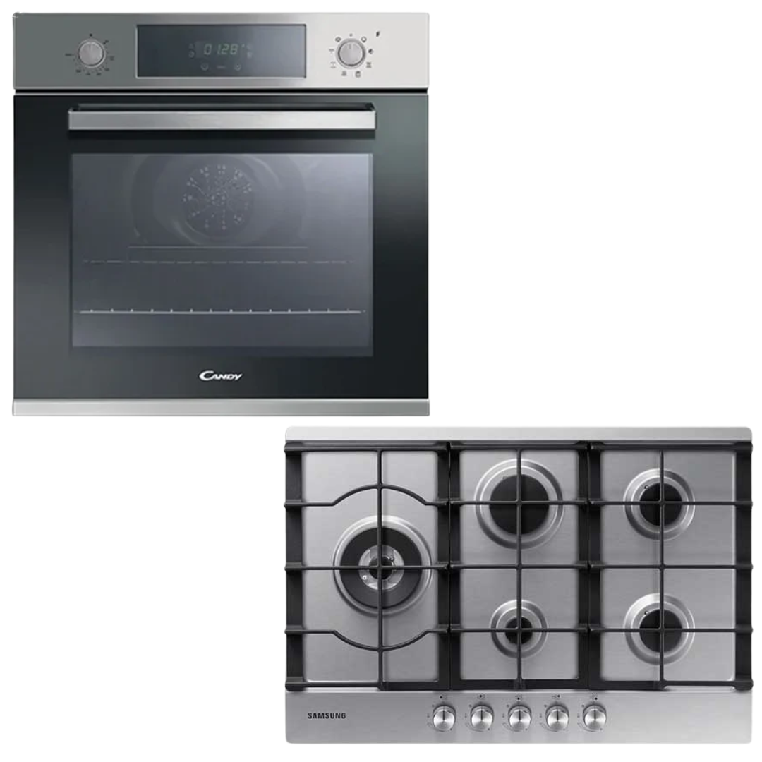 Incluye el Horno Eléctrico Candy FCP605X de 65 litros y el Anafe a Gas Samsung NA753030AS de 5 hornallas y 75 cm, una combinación perfecta para quienes buscan rendimiento y estilo profesional en su cocina.