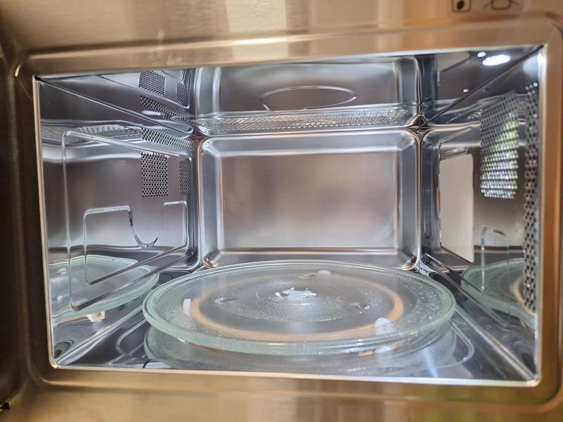 Diseño Elegante: Con una puerta de apertura lateral izquierda y un material interior de acero inoxidable, este microondas no solo es funcional, sino que también agrega un toque de elegancia a tu cocina.